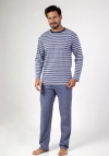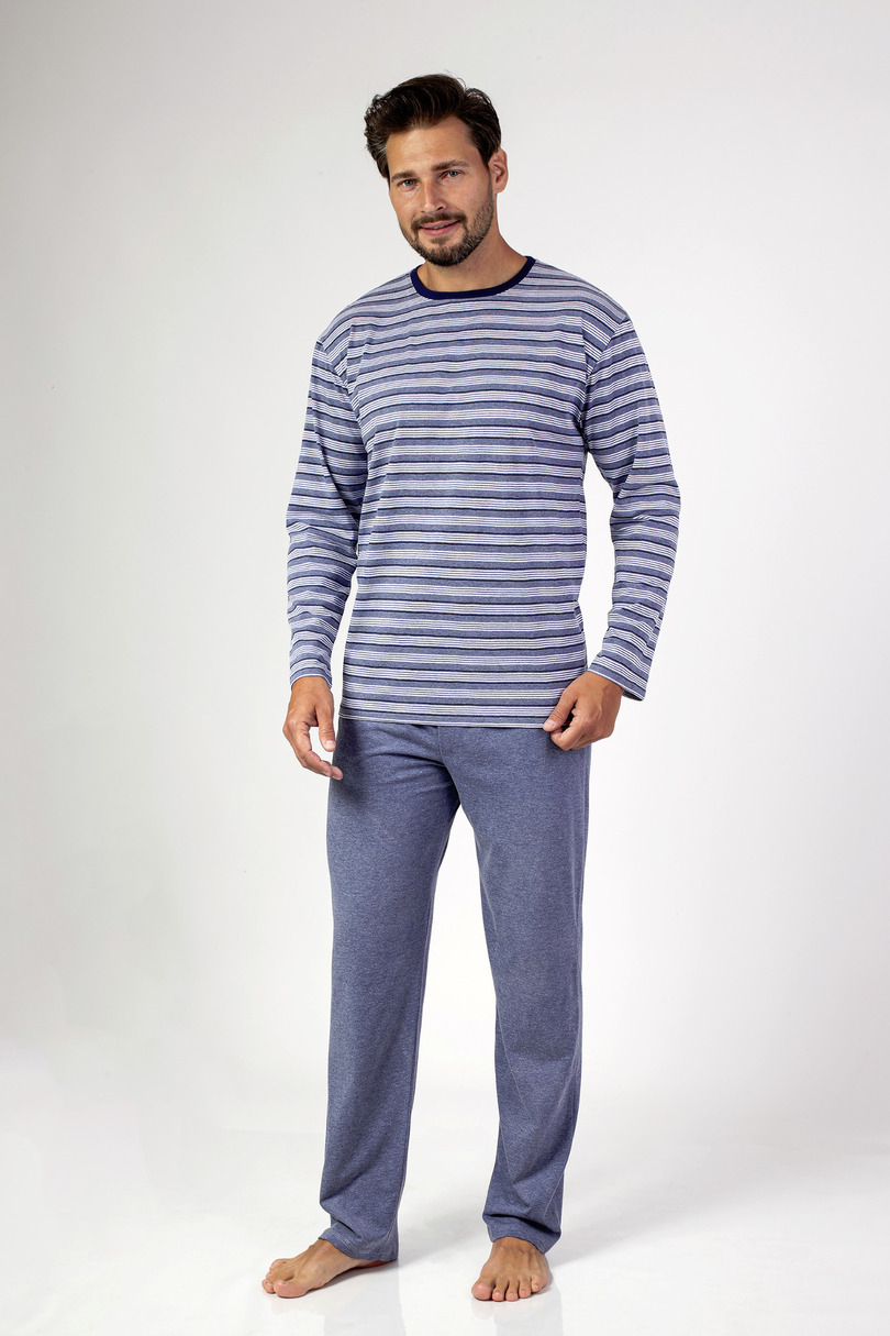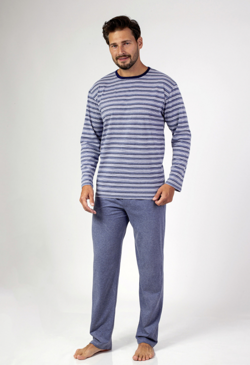 Klasyczna męska piżama z długim rękawem w paski i okrągłym dekoltem. Do kompletu długie jednolite spodnie. Skład: 100% Bawełna