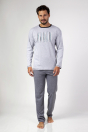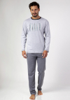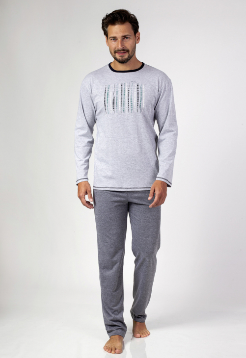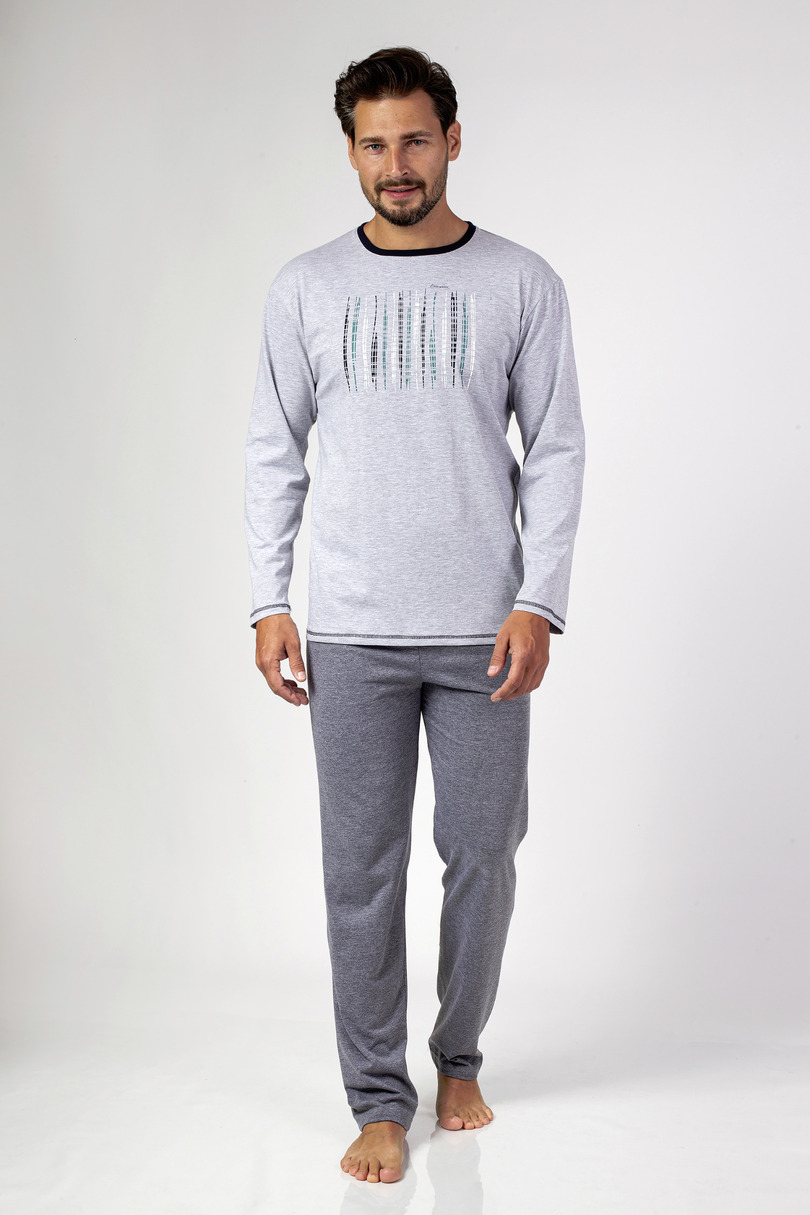 Klasyczna piżama męska z długim rękawem z wysokogatunkowej bawełny. Koszulka gładka z okrągłym dekoltem i nadrukiem klatki piersiowej. Do kompletu spodnie jednolite z długimi nogawkami. Skład: 100% Bawełna