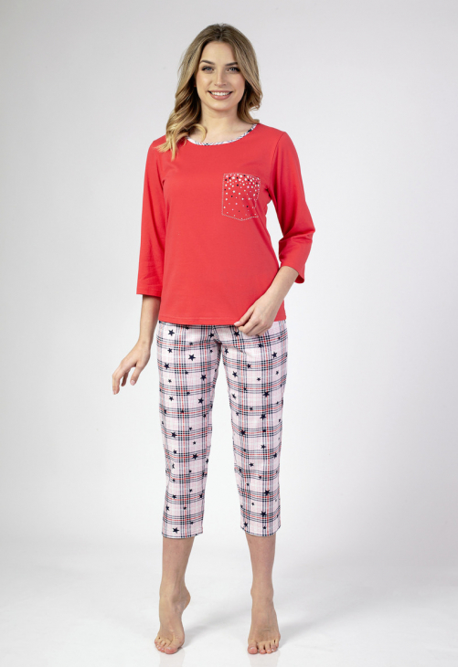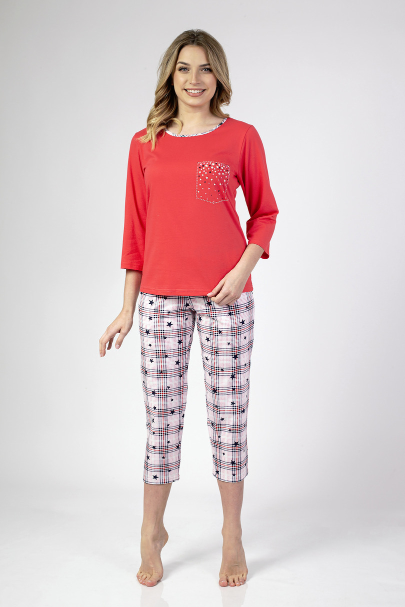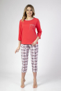 Piżama damska z rękawem długości 3/4, przód ozdobiony nadrukiem. Do kompletu wzorzyte spodnie długości 3/4. Skład: 100% Bawełna