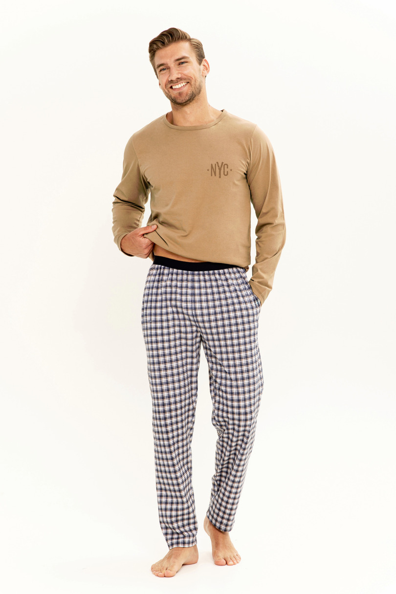 Piżama męska z długim rękawem, dekolt okrągły, na wysokości klatki piersiowej nadruk. Do kompletu długie spodnie w kratę z prostymi nogawkami i kieszeniami. Skład: 100% Bawełna