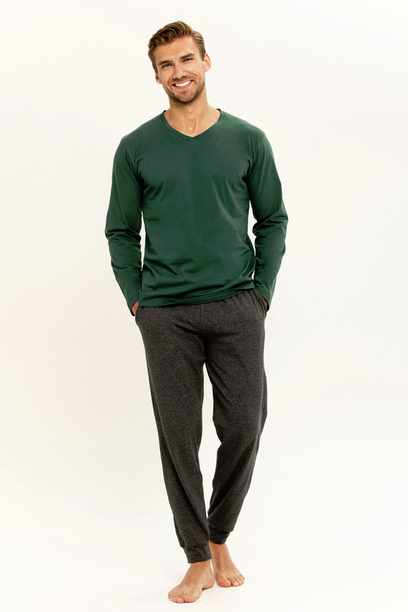 Piżama męska z długim rękawem, jednolta, dekolt w serek. Do kompletu melanżowe długie spodnie z kieszeniami, nogawki zakończone ściągaczem. Skład: bluzka 100% Bawełna, spodnie 75% Bawełna, 20% Poliester, 5% Elastan