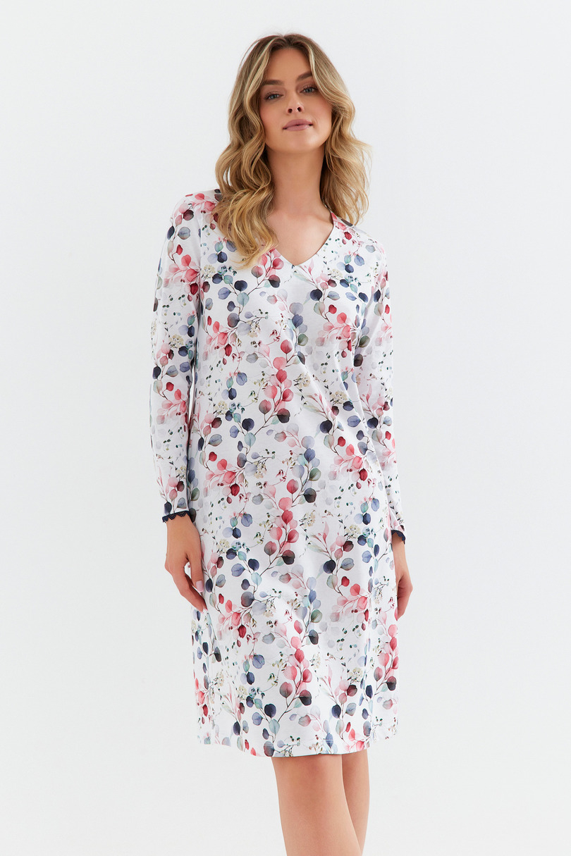 Koszula damska 406 Cana w eukaliptusy malinowo-granatowe materiał - singiel jersey, bawełna 100% piękny kwiatowy wzór w odcieniach granatu i maliny odszyty trójkątny dekolt rękaw długi ozdobiony delikatną koronką w kolorze granatowym klasyczny, taliowany krój długość do kolan