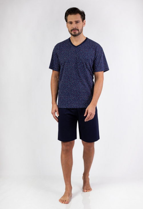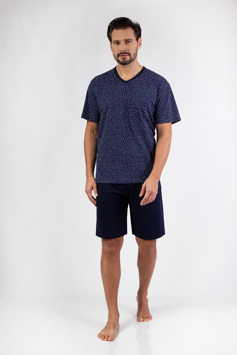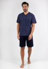 Klasyczna piżama męska z krótkim rękawem uszyta z wysokogatunkowej bawełny. Koszulka wzorzysta z dekoltem w serek. Do kompletu spodnie jednolite z krókimi nogawkami. Skład: 100% Bawełna