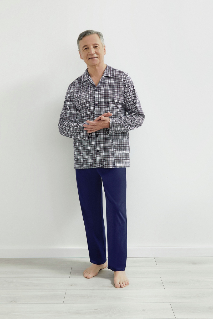 Dwuczęściowa piżama męska z rozpinaną koszulą w kratę i gładkimi spodniami. skład: 100% bawełna
