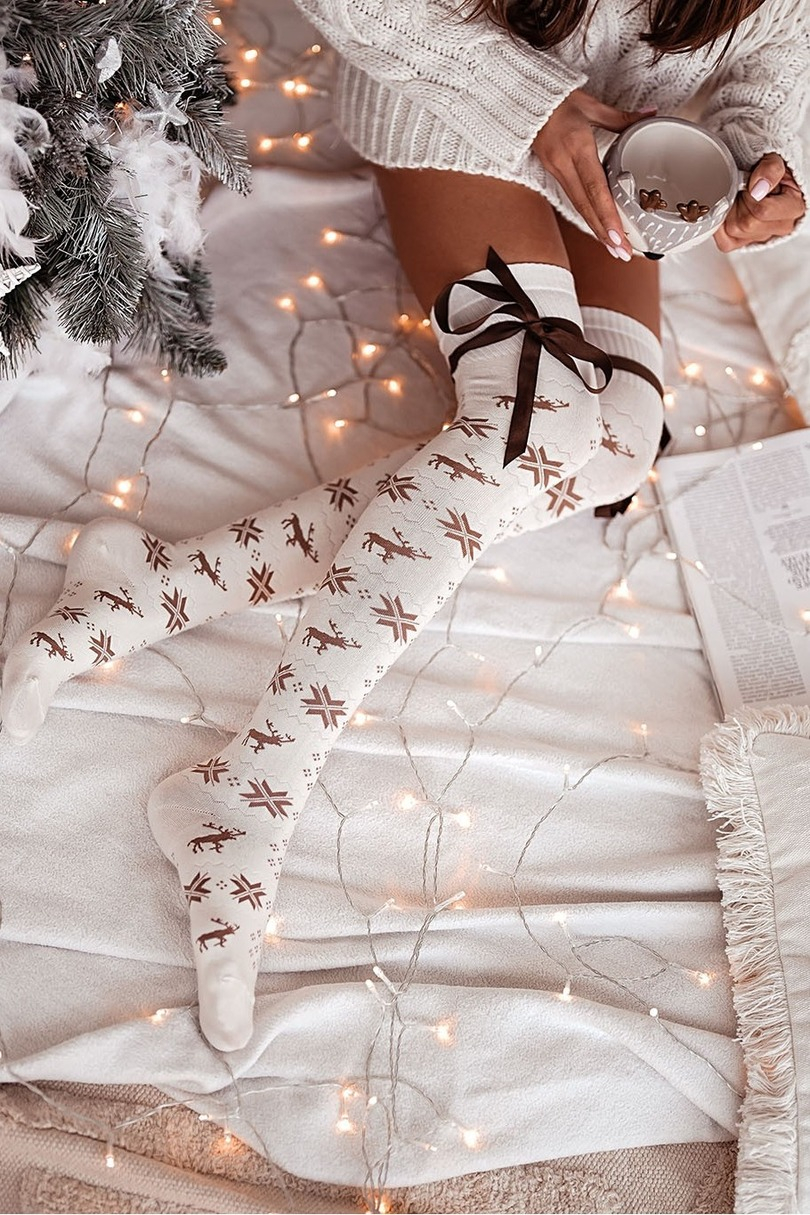 Zakolanówki damskie bawełniane, ozdobione świątecznym wzorem. Posiadają płaskie szwy oraz nieuciskający ściągacz, co zapewnia wygodę i komfort noszenia. Wykończone ozdobną tasiemką do wiązania kokardki.