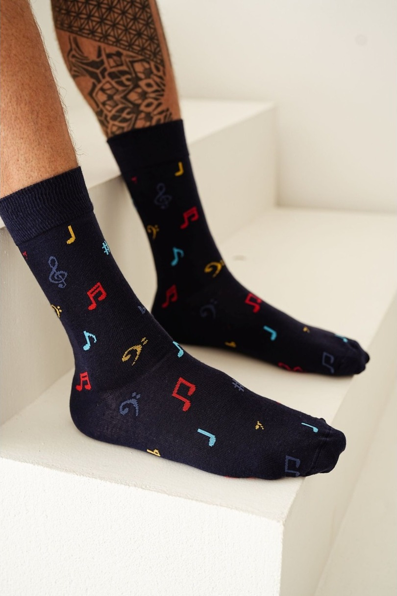 Skarpety męskie wzorzyste z motywami kolorowych nutek, dopasowują się do stóp i zapewniają wysoki komfort noszenia. Doskonale sprawdzą się w codziennych stylizacjach.