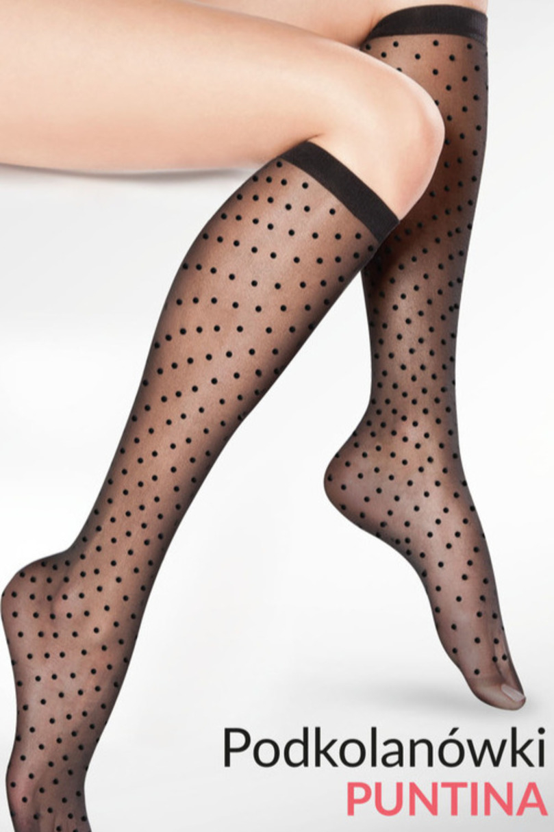Podkolanówki damskie zostały wykonane elastycznych włókien oplecionych jedwabiem poliamidowym, dzięki czemu są niesamowicie elastyczne, miękkie i przyjemne w dotyku. Podkolanówki w kropki Puntina są dostępne w dwóch wariantach kolorystycznych: czarne podkolanówki w kropki z czarnym wzorem na czarnym tle (nero) oraz jako cieliste podkolanówki z beżowymi kropkami (beige).
