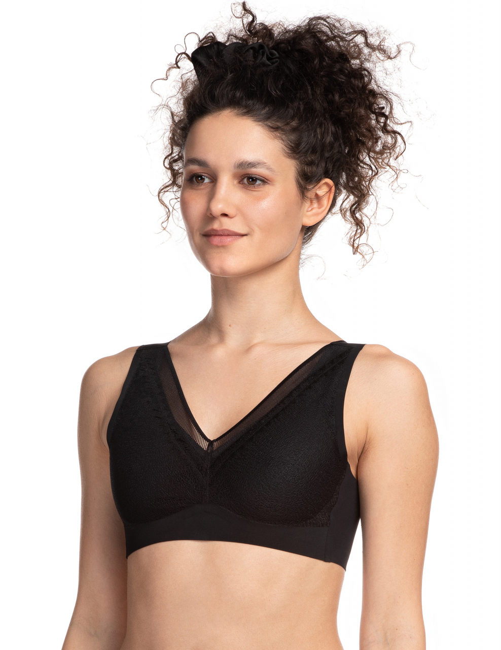 Biustonosz w kolorze czarnym wykonany z elastycznego materiału dopasowuje się do sylwetki. Posiada szeroką gumę z efektem unoszenia biustu, na plecach gładkie wykończenie.