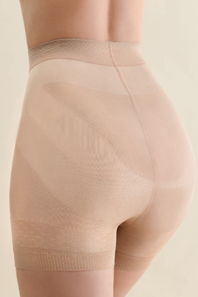 Majtki modelujące push-up posiadają specjalną, nieuciskającą gumkę w talii , która utrzymuje bieliznę na właściwym miejscu, wyszczuplając optycznie brzuch i unosząc pośladki. Przedłużone nogawki zapobiegają otarciom na udach. Lekko połyskliwa dzianina i ozdobny wzór nawiązują do estetyki eleganckiej, koronkowej bielizny.