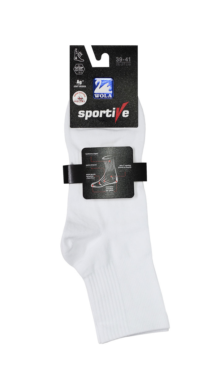 Skarpetki męskie sportowe gładkie z jonami srebra. Produkt wyróżnia system ściągaczy zapobiegający przesuwaniu się wyrobu na stopie, strefy kanalików odprowadzających nadmiar wilgoci i ciepła oraz oddychalność i płaski szef. Skład: 78 Bawełna, 3% Poliamid, 16% Polipropylen, 3% Elastan.