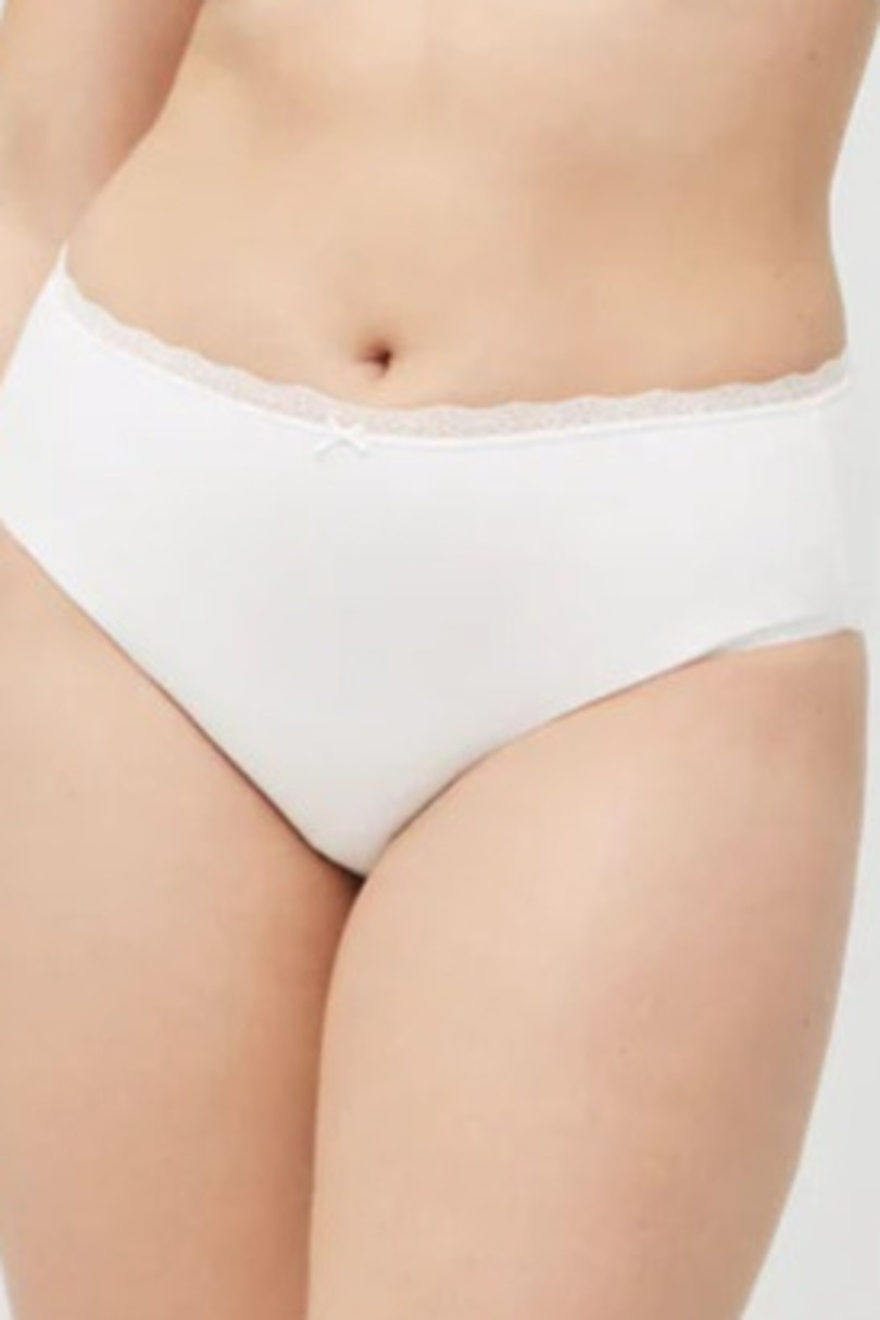 Figi damskie bwełniane, delikatnie wykończone przy nogawce, w pasie wąska bawełniana koronka. Skład: 90% Bawełna, 10% Elastan