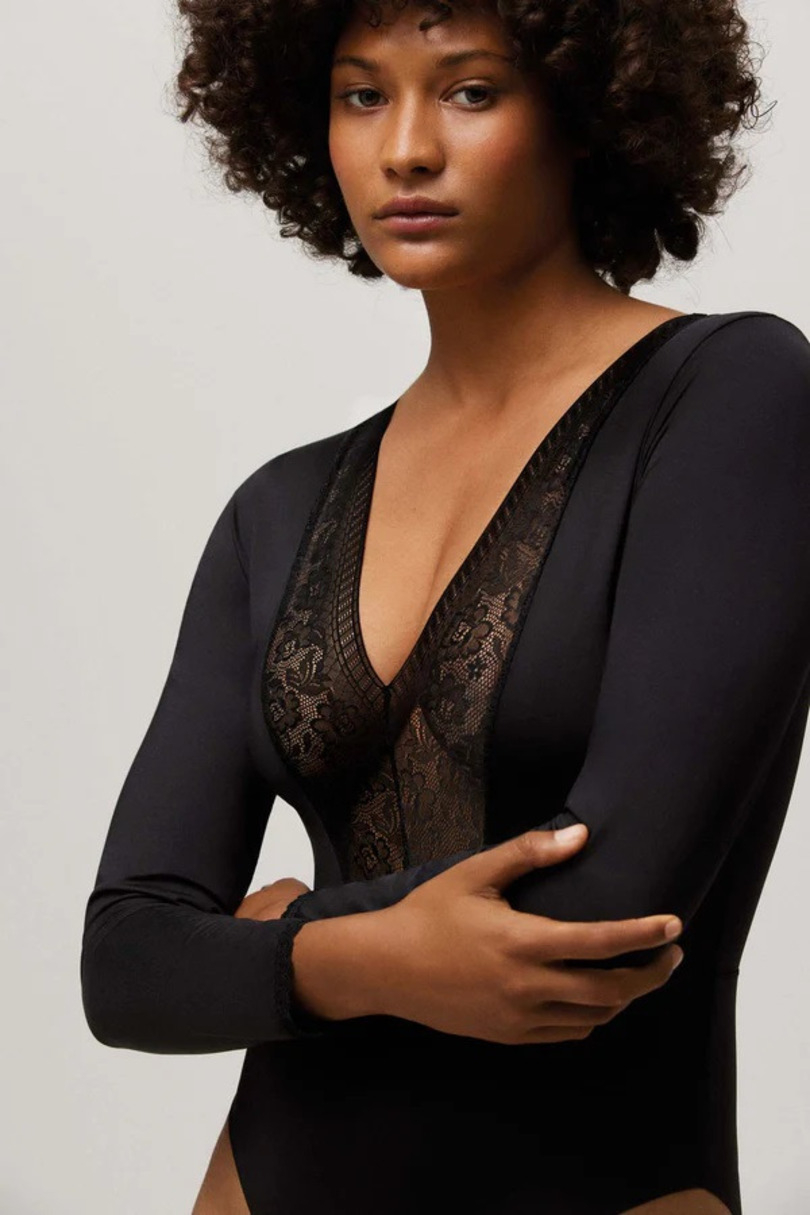 Body z długim rękawem i kwiatową koronką. Kobiecy i zmysłowy strój. Elastyczna tkanina z mikrofibry, miękka i bardzo elastyczna. Delikatny design zdobiony dekoltem i rękawami łączy w sobie jakość i elegancję Skład: 90% Poliamid, 10% Elastan