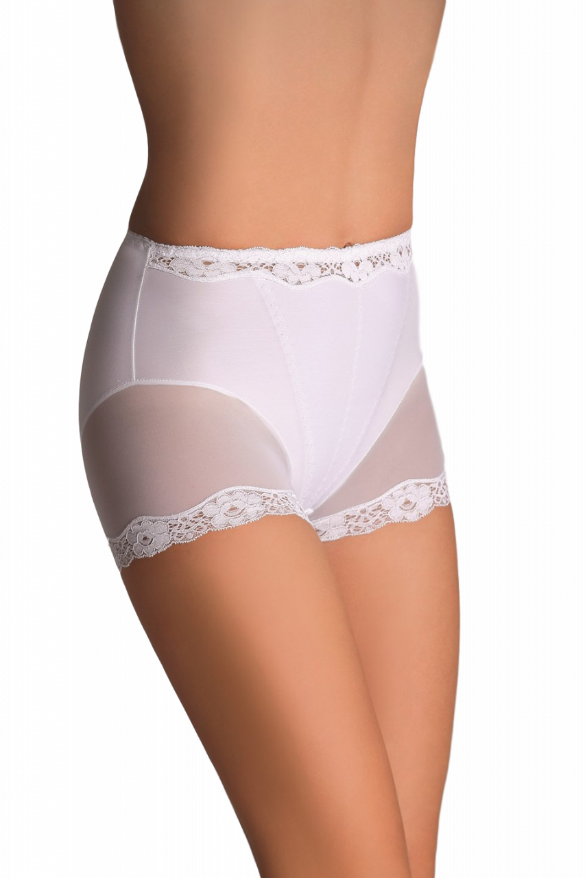 Majtki mocno korygujące brzuch z delikatnymi tiulowymi nogawkami, wykończone koronką.