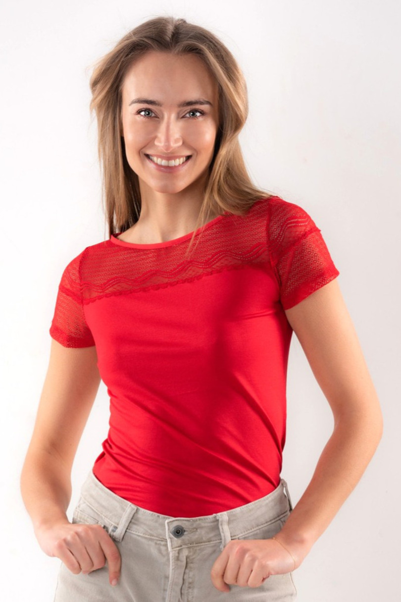 Elegancka bluzka damska z krótkim rękawem. Linia dekoltu z ażurowej koronki i delikatnej siateczki, natomiast tył prosty i gładki.
