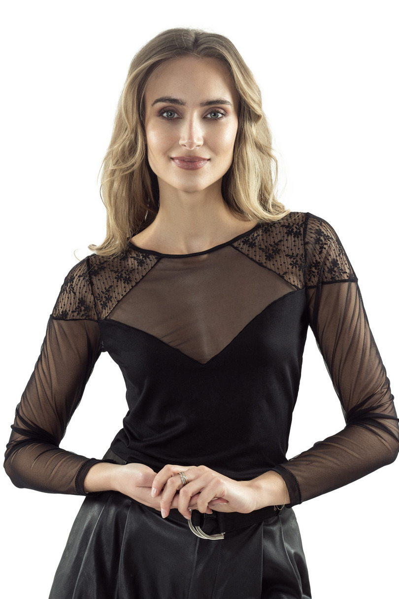 Dopasowana bluzka powstała z połączenia wiskozy, tiulu gładkiego i tiulu wzorzystego.