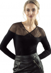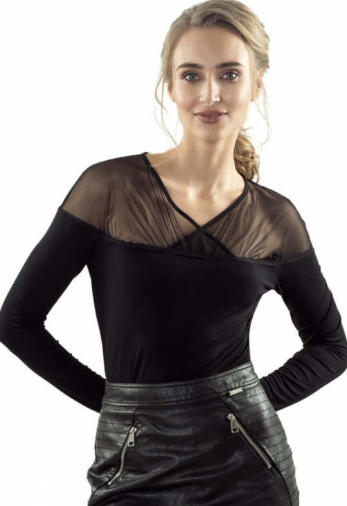Wyjątkowa bluzka z dekoltem a'la hiszpanka. Pokryta jest tiulem nachodzącym na siebie kopertowo nad biustem.