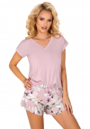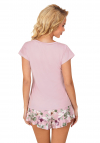 Składająca się z jednolitej kolorystycznie koszulki i wzorzystych spodenek piżama Nicola 1/2. Koszulka z oliwkowej lub jasno różowej delikatnie połyskującej materii. Dekolt niezbyt głęboki, w serek, zakończony szeroką plisą. Spodenki z różowej bawełny, na całej powierzchni zdobione wielobarwnymi kwiatami. Szeroka falbana wieńcząca nogawki sprawia, że szorty falują niczym spódniczka. Wyprodukowane w Polsce.