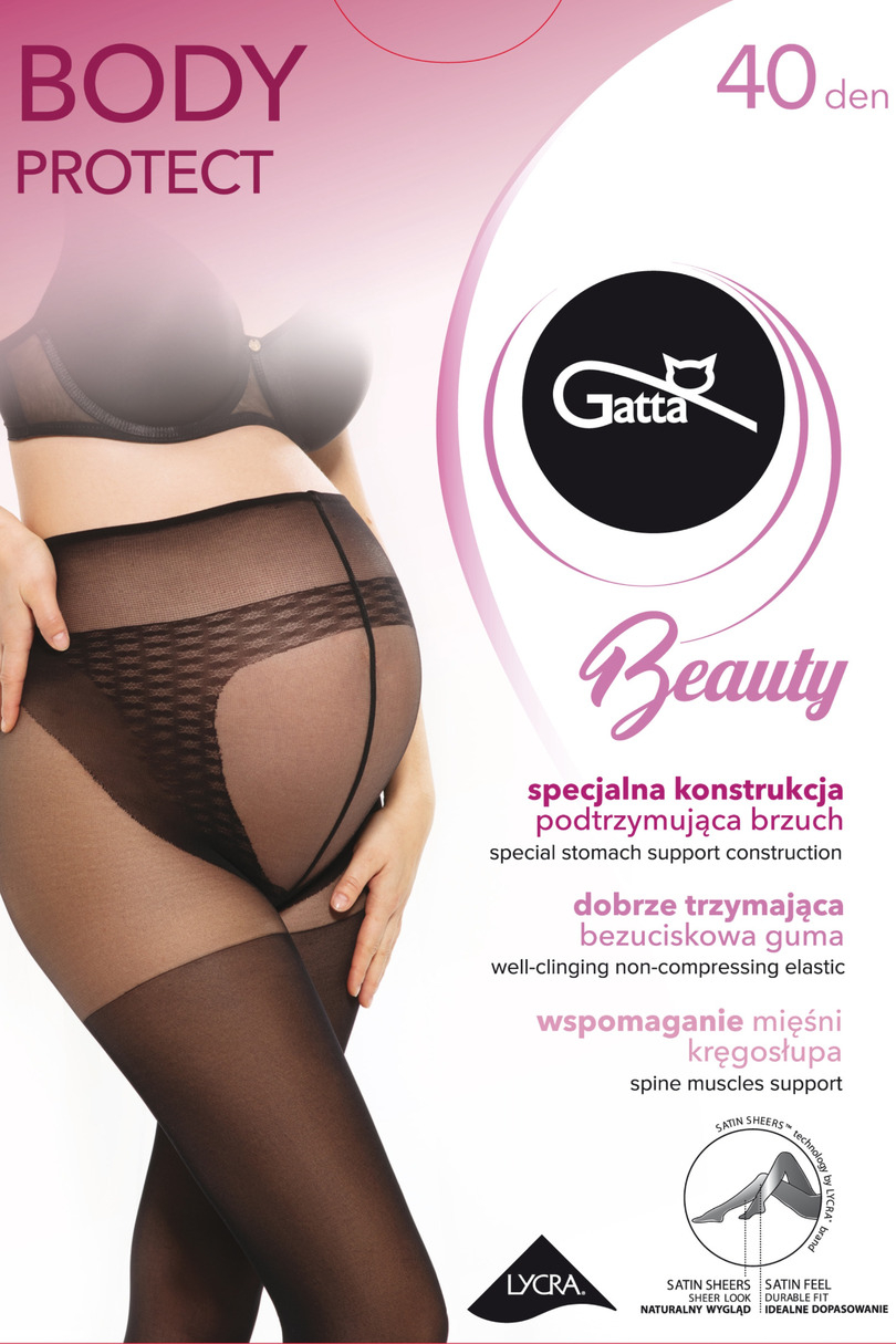 Rajstopy BODY PROTECT20 DEN, 40 DEN przeznaczone dla kobiet w ciąży, dzięki swej specjalnej konstrukcji majteczkowej i zastosowaniu bardzo elastycznej przędzy LYCRA Xceptionelle® delikatnie podtrzymują rosnący brzuch od spodu, nie powodując jednocześnie ucisku. Dodatkowe wzmocnienie w okolicy lędźwiowej odciąża plecy i wspomaga mięśnie kręgosłupa. Półokrągły klin z przodu pozwala na stopniowe rozciąganie się części majtkowej wraz ze zwiększającym się obwodem brzucha. Wysoko umieszczona bezuciskowa guma zapewnia wyjątkowy komfort noszenia przyszłej mamie.
