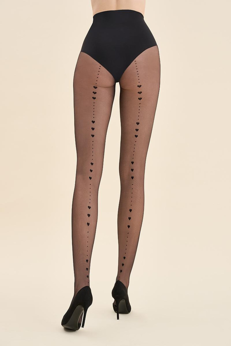 Eleganckie rajstopy Amori 20 den to propozycja dla kobiet, które pragną podkreślić swoją kobiecość w subtelny, ale efektowny sposób. Czarne, klasyczne rajstopy z przodu i zmysłowy, ozdobny szew z tyłu nogi tworzą harmonijną całość. Wzór w postaci serduszek przeplatanych drobnymi kropkami przyciąga spojrzenia, optycznie wysmukla sylwetkę i dodaje romantycznego uroku każdej stylizacji.