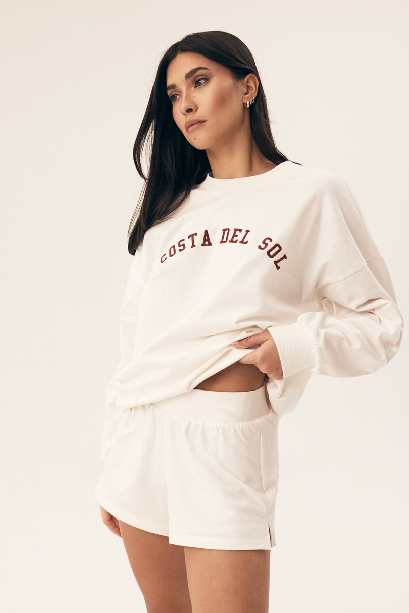 Bawełniana piżama damska idealna również jako homewear, sportowy fason, bluza z długim rękawem, dekolt okrągły, z przodu ozdobny haftowany napis, do kompletu krótkie spodenki, mankiety, dół koszulki i pas wykończone ściągac. Skład: 100% Wiskoza