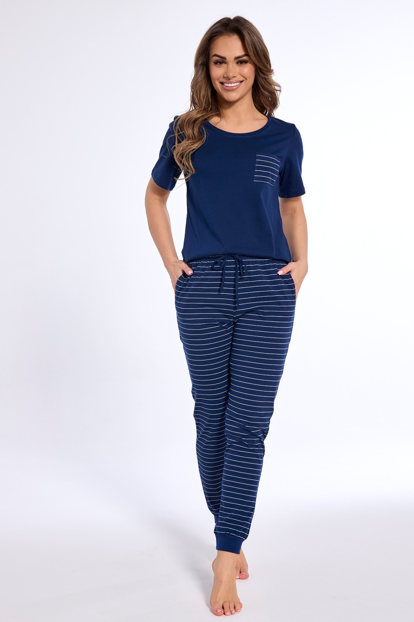 Piżama damska Jenny KR 730/317 to połączenie komfortu i stylowego designu, idealna na każdą porę roku. Koszulka z krótkim rękawem, wykonana w 100% z bawełny, jest miękka, przewiewna i przyjemna dla skóry. Naszyta kieszonka na piersi dodaje jej subtelnego uroku. Długie spodnie w paski, wykonane z 92% bawełny i 8% poliestru, gwarantują wygodę i swobodę ruchów. Elastyczna gumka w pasie i regulowany troczek pozwalają na idealne dopasowanie, a kieszenie na biodrach zwiększają funkcjonalność. Ściągacze na nogawkach zapobiegają podwijaniu się materiału, co dodatkowo podnosi komfort noszenia. Piżama zapakowana jest w eleganckie pudełko, co czyni ją idealnym pomysłem na prezent.