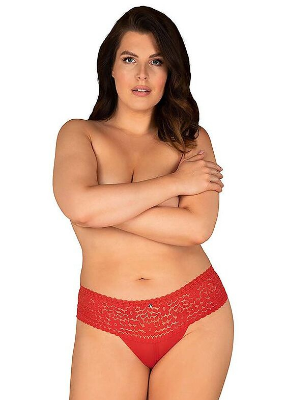 Czerwone figi zaprojektowane z myślą o sylwetkach w większym rozmiarze. Zdobione kwiecistą koronką, która zgrabnie otula biodra z obu stron. Wygodny, atrakcyjny fason. Miękka, przyjemna w dotyku dzianina.