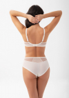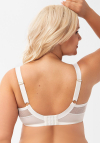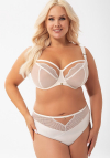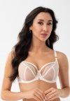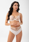 Biustonosz miękki przeznaczony dla kobiet ze średnim dużym i bardzo dużym biustem. Zapewnia efekt mocnego uniesienia i zebrania biustu do środka, 3-częściowe miski wykonane z tiulu stabilnego oraz koronki elastycznej o wyglądzie kabaretki. Górna krawędź miski wykończona szeroką taśmą. Dla zwiększenia komfortu użytkowania górna krawędź pasa obwodu wykończona miękkimi lamówkami. Tył z kryjącej lycry połączonej z koronką elastyczną i tiulem. Tył z kryjącej lycry połączonej z koronką elastyczną i tiulem. Krzyżujący się mostek, wyprofilowany tak, aby nie powodować ucisków. Fiszbiny boczne zapobiegające zwijaniu się materiału. W zależności od rozmiaru dwu lub trzyrzędowa haftka z trójstopniową regulacją obwodu. Nieodpinane, regulowane ramiączka w trzech szerokościach. Metalowe elementy w kolorze jasnego złota (nie zawierają niklu).