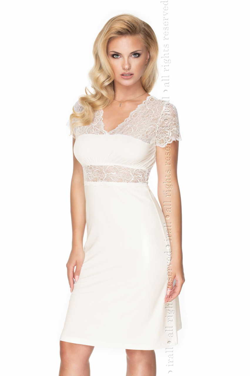 Delikatna, jasna koszulka nocna wykonana z połączenia miękkiej wiskozy i pięknej, stylowej koronki. Bardzo kobiecy krój z bogatą, koronkową górą i krótkimi, koronkowymi rękawkami, wpada w oko. Krój lekko dopasowany do ciała, luźniejszy w dolnej części - z pewnością poczujesz się w niej pięknie i bardzo wygodnie.