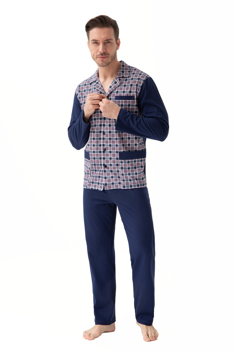 Piżama męska uszyta z wyjątkowo miekkiej bawełny. Bluzka w kratę, zapinana na guziki z kołnierzykiem i z kieszeniami. Spodnie długie, jednolite. Skład: 100% Bawełna
