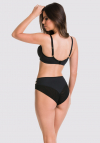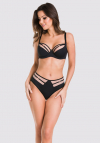 Biustonosz miękki. Miseczki wykonane z beżowej siatki, dół pokryty czarną mikrofibrą z wzorem imitującym skórę węża. Na górę miseczki na beżową siatkę naszyto paseczek z ozdobnym kółeczkiem, brzeg miseczki wykończony czarną lamówką. Obwód z mikrofibry, brak bocznej fiszbiny. Konstrukcja Deziro pięknie okala piersi, zbiera z boków i modeluje dekolt, idealny na średnie i duże biusty.