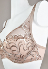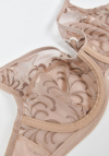 Biustonosz miękki w konstrukcji COSMO, która charakteryzuje się pełną miską, która okala pierś i bardziej ją zakrywa w górnej części. Dolna część miski wykonana z haftu z nitek od ecru do mocca co daje efekt ombre, ramiączka i taśmy w kolorze beżowym. Obwód ze stabilnej siatki zapewni maksymalne podtrzymanie biustu. Konstrukcja jednocześnie stabilna i lekka skierowana dla pań ze średnim, dużym i bardzo dużym biustem.