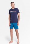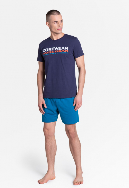 Sportowy styl, ponadczasowe kolory i miękka bawełna - oto doskonały wstęp do wygodnej, męskiej piżamy. Klasyczny t-shirt z krótkim rękawem i nadrukiem na środku uzupełniają gładkie, spodenki do okolic kolan. Najnowsza kolekcja. Skład: 100% bawełna.