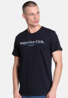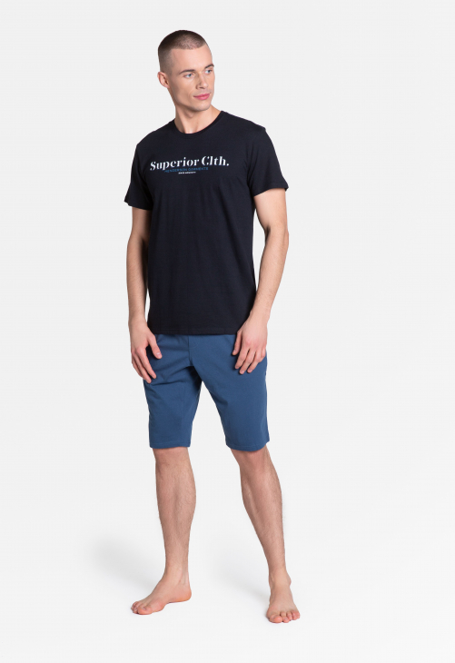 Wygodna, dwuczęściowa piżama męska z nowej kolekcji marki Henderson, w świetnej kolorystyce. Góra w formie czarnego, wygodnego t-shirtu z nadrukiem. Spodnie grafitowe, do okolic kolan, z modnym akcentem w postaci drukowanej gumy w pasie. Świetny, sportowy Look, w którym każdy mężczyzna poczuje się komfortowo i swobodnie.