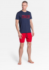 Granatowo-czerwona, męska piżama z nowej kolekcji marki Henderson. Bluzka z gumowanym nadrukiem Henderson Core, z efektem 3D (nadruk wyczuwalny w dotyku) - stylowa i zdecydowanie z charakterem, może posłużyć Ci również jako homewear. Spodnie na gumce uzupełnione troczkami do wiązania. Skład: koszulka 80% bawełna, 20% poliester, spodnie 100% bawełna.