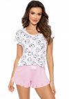 Komfortowa i stylowa piżama damska, która łączy wygodę z kobiecym urokiem. Góra to bluzka z krótkim rękawem i półokrągłym dekoltem, ozdobiona modnym nadrukiem. Do kompletu krótkie spodenki z elastyczną gumką w pasie oraz uroczą kokardką. Nogawki wykończone delikatną falbanką dodają lekkości i dziewczęcego charakteru. Całość wykonana z miękkiego, przyjemnego w dotyku materiału. Produkt pakowany w praktyczny woreczek foliowy, idealny również na prezent.