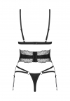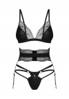 Biustonosz, pas do pończoch oraz stringi uszyte z dbałością o każdy szczegół. Koronkowe wykończenie i czarny materiał tworzą idealny duet. Haftki na plecach, regulowane ramiączka oraz paski zadbają o komfort i zmysłowy wygląd.