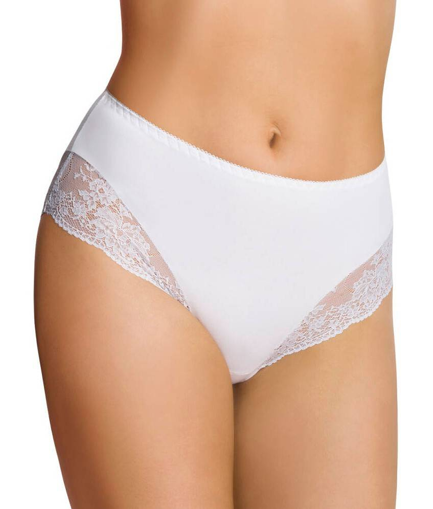 Bawełniane figi damskie o wysokiej talii i zabudowanych biodrach. Wykończone ażurowa koronką o kwiatowym motywie.