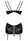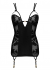 Zjawiskowa sukienka "Xiomara" wykonana z delikatnej koronki i weluru, która podkreśla kobiecą sylwetkę. Miseczki z fiszbinami pięknie eksponują biust, a regulowane ramiączka zapewniają komfort. Tył sukienki zdobi efektowne sznurowanie, które dodaje elegancji. Paski do pończoch dopełniają zmysłowy wygląd sukienki. W komplecie stringi z weluru, które idealnie współgrają z sukienką. Idealna na romantyczne wieczory i specjalne okazje.