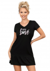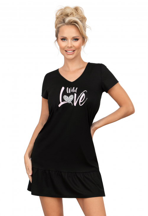 Bawełniana koszula nocna czarna Pantera z nadrukiem. Posiada krótki, klasyczny rękawek oraz dekolt w kształcie V, który dodaje jej subtelnej kobiecości. Dół koszulki jest ozdobiony falbanką, co nadaje jej uroku i delikatności. Idealna dla kobiet ceniących sobie wygodę i styl podczas snu.