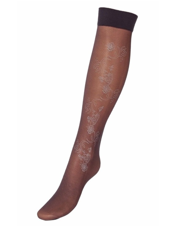 Podkolanówki damskie z pięknym, roślinnym nadrukiem. Grubość: 20 den. Skład: 80% poliamid, 20% elastan.
