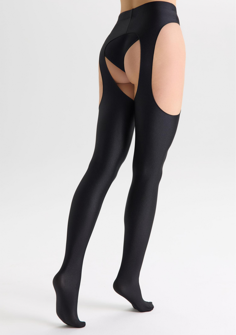 Mocno kryjące rajstopy typu strip panty z intensywnym połyskiem. Grubość 160 den. Wycięcie w kroczu, wygodna gumka, niewidoczne wzmocnienie palców, połysk,szew wewnątrz nogi. Skład: 85% poliamid, 18% elastan.