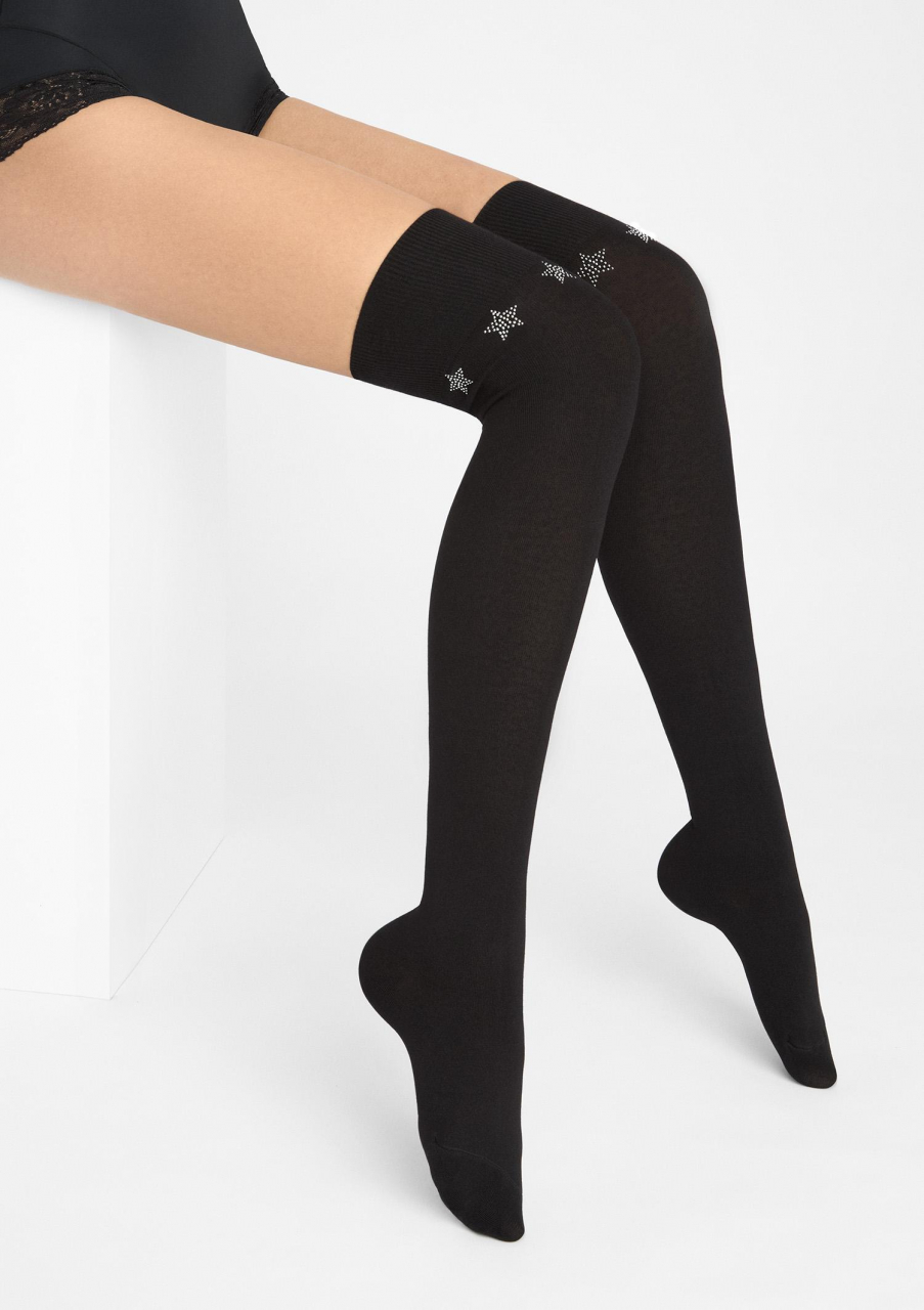 Zazu 899 Stars - klasyczne zakolanówki bawełniane ozdobione dżetami w kształt gwiazdek. Posiadają nieuciskający ściągacz. Niezbędne w Twojej szafie, niezależnie od zmieniających się trendów. Wyjątkowo miłe dla Twoich nóg.