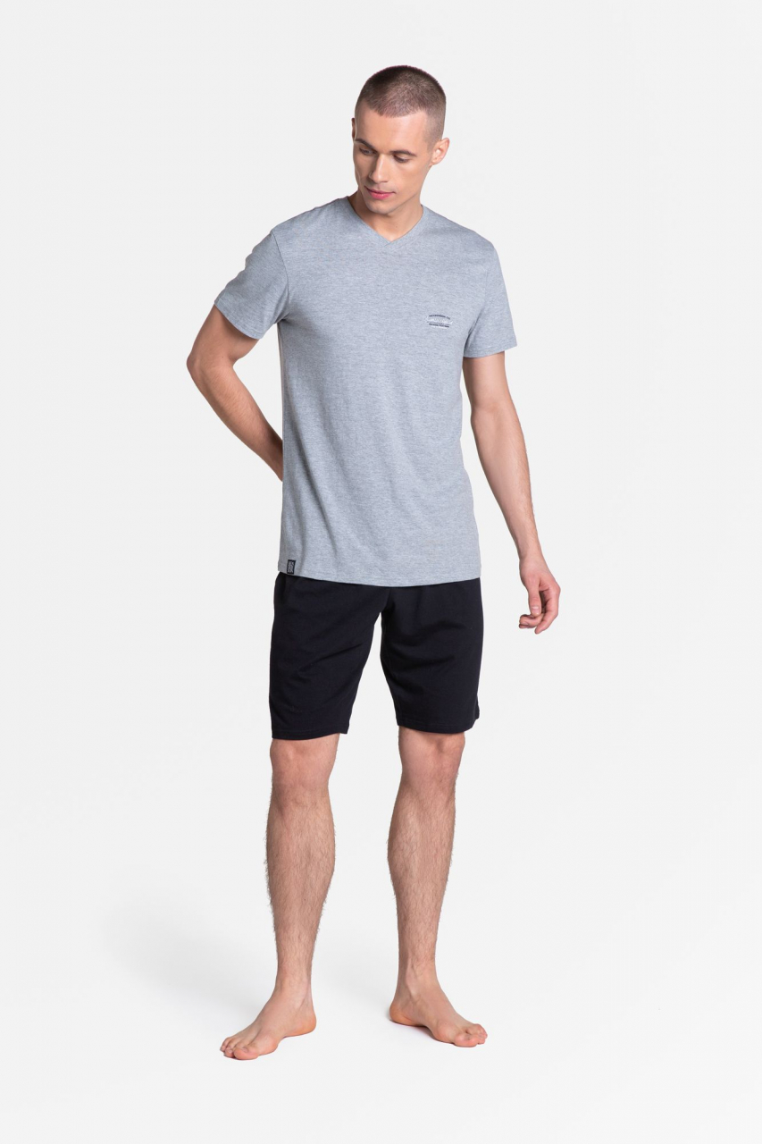 Kto lubi gładkie piżamy w dobrej kolorystyce trafił doskonale. Duty - najnowsza piżama marki Henderson stawia na wygodny krój i dobrze dobrane barwy. T-shirt wyróżnia się subtelnym V-dekoltem a na piersi możesz dostrzec mały napis. W zestawie gładkie, czarne spodnie do okolic kolan. Luz i komfort na lato! Skład: góra 88% bawełna, 12% poliester, dół 100% bawełna.