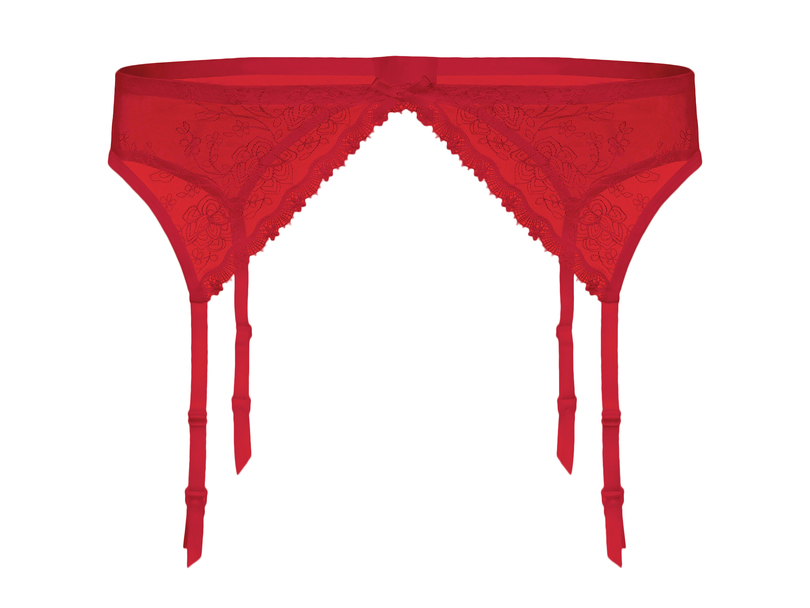 Zmysłowy pas do pończoch, wykonany z koronki. Pas po środku ozdabia kokardka. Pas o niskim stanie, tył gładki. Zapięcia dwurzędowe z dwiema haftkami.