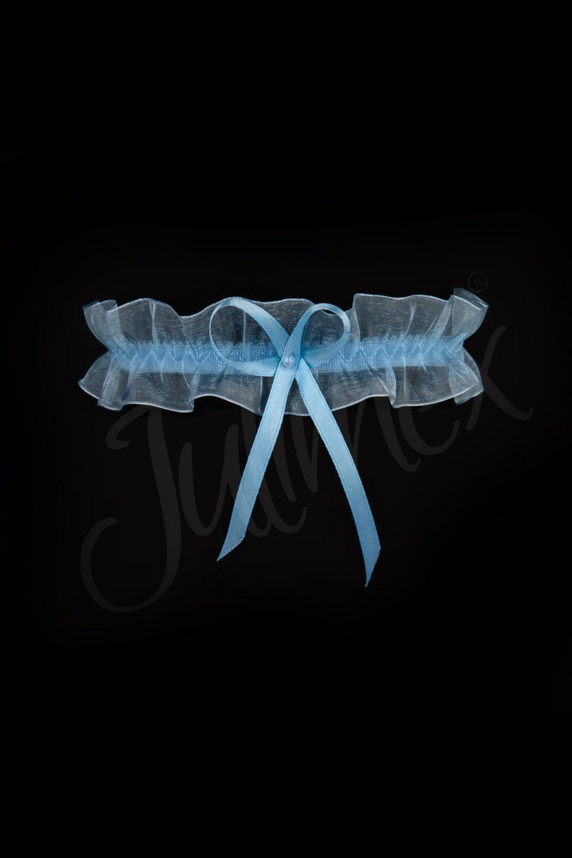 Niebieska podwiązka PW-02 to klasyczna, delikatna propozycja z gładkiego tiulu, z ozdobą w postaci kokardki i perełki. Idealna na ślub i nie tylko. Skład 90% poliester, 10% elastan.