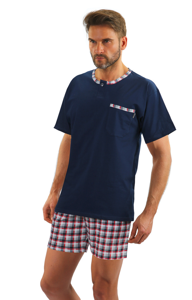 Piżama męska Jasiek z krótkim rękawem wykonana jest z wysokiej jakości bawełny. Składa się z koszulki - dekolt, zapięcie oraz ozdobna kieszonka wykończone lamówką, oraz spodenek w kratę typu Madras. Skład: 100% bawełna
