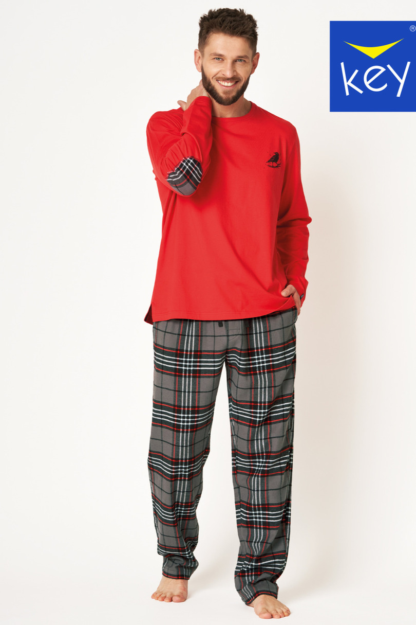 Piepła męska piżama. Energetyczna czerwień w połączeniu z bielą i szarością. Bluzka wykonana z klasycznej, miękkiej bawełny jest trwała w użytkowaniu i na długo zachowuje swoją formę. Góra z okrągłym dekoltem wykończonym dzianiną rib, dzięki czemu dekolt zachowuje kształt nawet po wielu praniach. Klasyczny krój góry z delikatnym rysunkiem na piersi, zabawne łaty na łokciach. W komplecie spodnie o prostym kroju nogawki. W pasie wygodna, miękka guma, a przodu rozporek na guziki. Po bokach głębokie, dyskretne kieszenie. Bluza: 100% Bawełna. Spodnie: 100% Bawełna, tkanina flanelowa.
