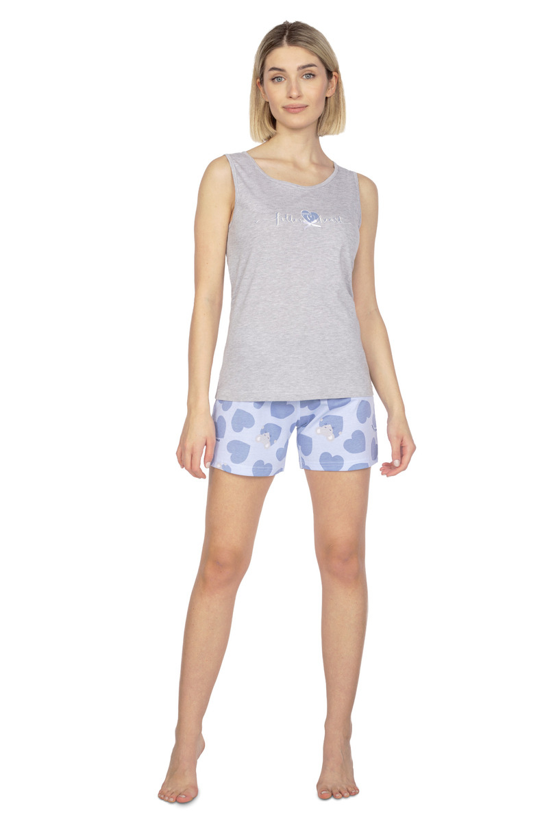 Piżama damska na szerokim ramiączku uszyta z miękkiej bawełny. Na wysokości klatki piersiowej nadruk. Do kompletu wzorzyste krótkie spodenki. skład: 100% bawełna