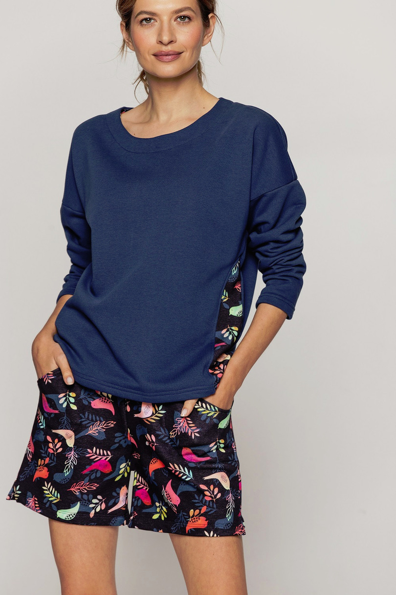 Komplet z dzianiny dresowej. Wygodny komplet – bluza i spodenki z wysokogatunkowej, trwałej dzianiny dresowej, komfortowej w użytkowaniu. Modny, młodzieżowy fason. Dres może służyć jako odzież domowa, jak i do aktywności turystyczno-sportowych. Bluza: długi rękaw, dekolt okrągły, po bokach wstawka z wzoru Spodenki: krótkie, z wygodnymi kieszeniami, po bokach rozporki Skład: bawełna 90%, poliester 10%