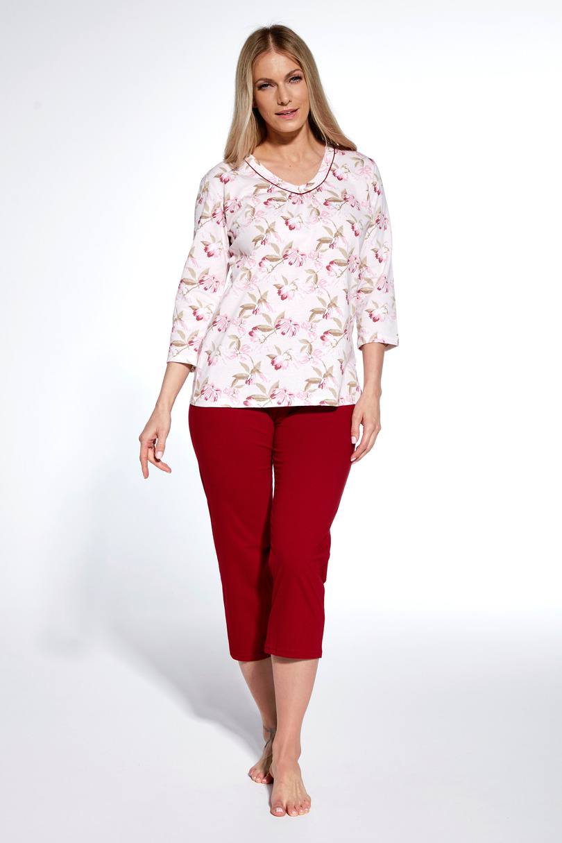 Piżama damska uszyta z wysokiej jakości miękkiej bawełny. Koszulka z rękawem 3/4 , wzorzysta w serek. Do kompletu jednolite spodnie długości 7/8 z prostymi nogawkami. Piżamka pakowana w pudełko.